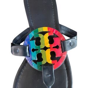 A rare and vibrant edition of the iconic Tory Burch Miller sandals, featuring a rainbow medallion on classic black leather. Known for their timeless cutout design, these sandals are both stylish and collectible.