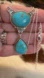 For your consideration is this Tyrone turquoise necklace, a striking piece featuring two individual turquoise stones set in detailed sterling silver bezels. The upper stone is an oval shape, while the lower, dangling stone is a teardrop or pear shape. The turquoise itself is a beautiful blue color with a subtle tan or brown matrix visible in both stones. The settings are adorned with a twisted rope design and scalloped edges, typical of Southwestern style jewelry. The pendant hangs from a delicate sterling silver chain which includes a lobster clasp and an extender for an adjustable fit, with a total length of approximately 18 inches with a 2-inch extender. This substantial piece has a weight of around 15.4 grams.
