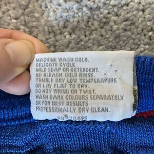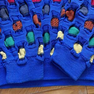 Gently used vintage condition with visible wear. Sweater has several stains in different areas on front. Not very noticeable from a distance. Some loose threads typical of older COOGI knits. No holes noted. Colors remain vibrant and the 3D texture is strong. Please review photos carefully.
