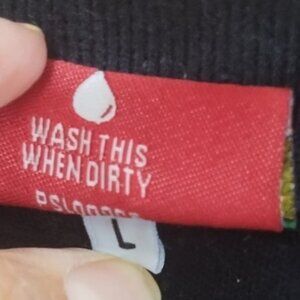 Cotton, measurements are 21" pit to pit and 28" length, heavier weight, appliques are in good shape, color is black, buttons are intact, unique, good condition and quality