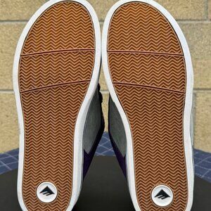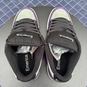 Introducing the Rare VTG Emerica The Mob Suede Skateboarding Sneaker Shoes in an eye-catching Black and Purple colorway. Designed for skateboarding enthusiasts and fashion-forward individuals alike, these sneakers are crafted with premium suede material, offering both durability and a luxurious feel. The contrasting black and purple hues create a bold and stylish look, perfect for streetwear or casual outfits. With a comfortable fit in Size 9, they provide optimal support and cushioning for all-day wear. The shoes feature a classic lace-up design and a sturdy rubber sole for enhanced grip and traction. Whether you're hitting the skate park or stepping out in style, these vintage-inspired sneakers are a must-have addition to your collection. Elevate your footwear game with the Rare VTG Emerica The Mob Suede Skateboarding Sneakers.