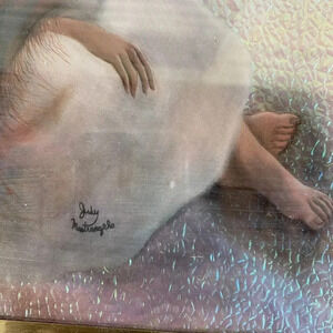 This rare vintage art print by Judi Strangelo features a beautiful abstract design of a girl and the moon. Measuring 8 x 10 inches, this licensed reprint is printed on glossy paper and comes framed. The foiled art print technique adds a unique touch to the piece, making it a one-of-a-kind addition to any art collection.