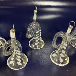 Rare VTG Lot Of 6 Hand- Blown Clear Glass French Horn Christmas Ornaments - D8