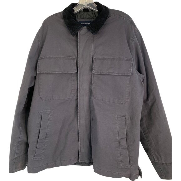 This Abercrombie & Fitch jacket offers a blend of style and comfort with its relaxed fit and durable canvas material. The gray jacket features a contrasting black collar, providing a classic yet contemporary appearance. The jacket is designed for colder season use, featuring a lined and insulated interior to ensure warmth and comfort.