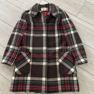 Marks throughout. Plaid pattern does a good job hiding marks. Missing Size Tag. Lining has tears in the underarms. See Photos