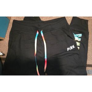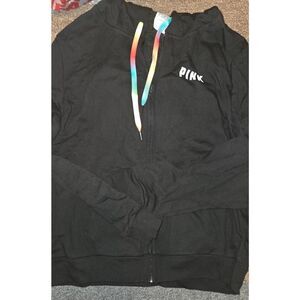 HTF Victoria's Secret Pink Black Full Zip Hoodie with tye dye strings. The back says Pink in sequin. The jogger pants also say Pink in sequin on the side leg. These are brand new with tags attached. Both size Large.