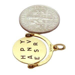 This is a rare vintage Art Deco era, 14K yellow gold spinner charm or pendant that was crafted back in the 1930s. This spinner is enameled in mixed black lettering on both sides that you piece together, which spell out the words "HAPPY ANNIVERSARY". This charm is outstanding in quality and craftsmanship. It is stamped 14K and is hallmarked with a maker's mark with an A that has an arrow through it. It is pictured on top of a US dime in this listing for size comparison and is in excellent pre-owned condition! The original jump ring is closed and was not cut. Vintage 14K gold spinner charms that read "Happy Anniversary are very rare and seldom seen!