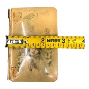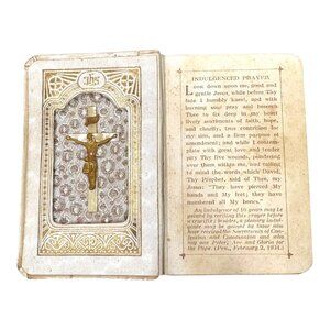 A timeworn spiritual companion whispers stories of faith, inviting contemplation and reverence through its delicate imagery and worn pages. This vintage prayer book offers a deeply personal connection to religious tradition, with intricate illustrations and a golden crucifix that speaks to moments of quiet reflection and spiritual connection. • Vintage religious text with ornate crucifix • Delicate golden-edged pages • Intricate religious imagery • Worn leather-like binding • Contains indulgenced prayer text Slight edge wear, binding slightly separated, pages aged with vintage patina. Length approximately 4 inches.