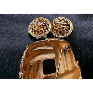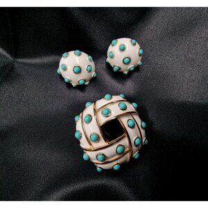Rare Vintage 1960s TRIFARI White Enamel & Turquoise Cabochon Brooch & Clip-On
