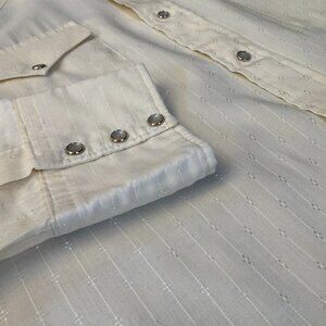 Rare vintage Ruddock Bros Western shirt featuring a textured striped fabric in an eggshell hue, pearl snap closures, and classic Western yoke detailing. Made in the USA.