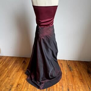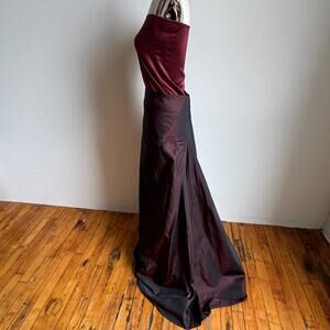 Details: Rare vintage 2000's CALVIN KLEIN Silk Taffeta Maxi Skirt and Strapless Top Set. Burgundy silk taffeta sculptural A-line maxi skirt with diagonal zipper & asymmetrical seams and darts. With matching burgundy double-layered stretch silk strapless tube top. Make a gorgeous silhouette. Skirt has a silk georgette lining.