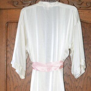 Rare vintage Victoria’s Secret robe from August 2005 (per tag) part of the iconic silk era. This time period is true Silk construction! Color is an elegant ivory/cream. Features side pockets and a self-tie belt (original belt is missing so added a pink Silk tie). Robe is designed to skim the ankles for a beautiful silhouette. Length is approx 52.5" inches.