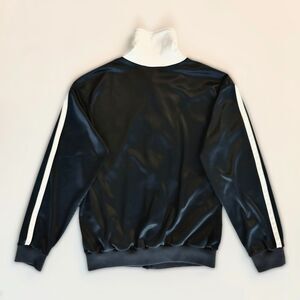 The jacket is made from a distinctive Arnel Triacetate and Polyester blend, which is the signature fabric of the highly sought-after vintage Adidas ATP Keyrolan line. The color is a deep navy, almost black, with a contrasting cream single stripe on each sleeve.