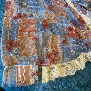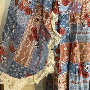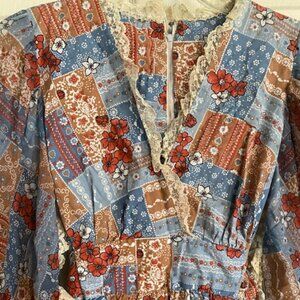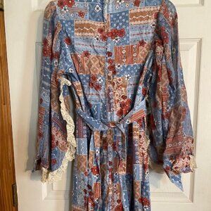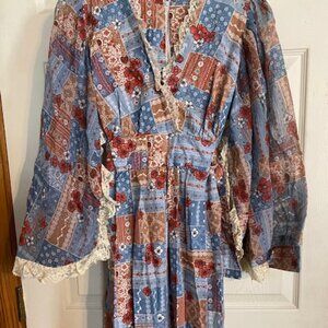 A very rare, hard to find vintage 70's hippie maxi dress with large butterfly sleeves, lace trim, belted sash tie waist, button cuffs on sleeves, to the floor maxi, faux denim patch design, cotton blend, size small to medium, measurements: Chest 39 in, waist 34 in, sleeve 23 in.. You can not get much more 70's than this dress!