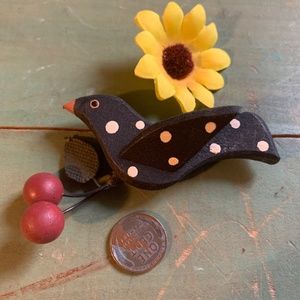 ๐ Wood bird is painted black with white polka dots - with its tiny claws it's holding two cherries/ berries๐๐