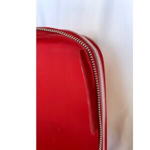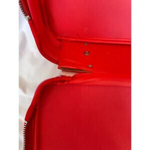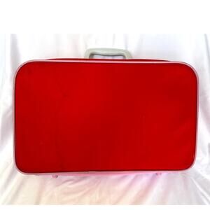 Nostalgic child- sized hard-sided suitcase perfect for an overnight trip or as a cute display piece. This rare collectible find is a vibrant red color fabric with pink faux leather accents and features an image of Hello KItty in a hot air balloon with a mouse and rainbow.