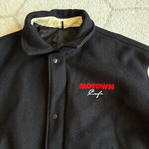 Tags: Motown Cafe jacket, Las Vegas collectible jacket, vintage varsity jacket, wool leather jacket, 90s Las Vegas memorabilia, retro embroidered jacket, Motown mic jacket, Vegas history collectible, vintage cafe jacket, rare varsity coat