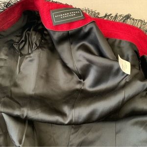 Rare museum worthy vintage 90s Richard Tyler Couture red coat with snakeskin, black velvet and lace trim. No size or fabric content tags. Most of the rest of the coat feels like a wool blend perhaps with some mohair. Overall, the coat is in excellent condition the only issue I see is a tiny hole at the hemline. This coat was a sample so probably one of a kind and a collector's piece. Sizing appers to be for a medium but my manniquin is a size 4 and it looks good on that size too.