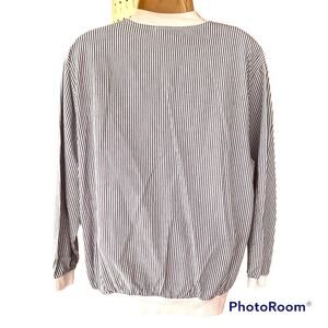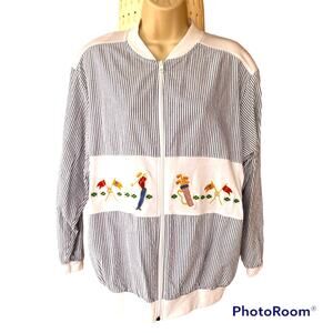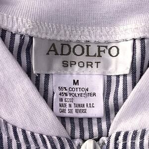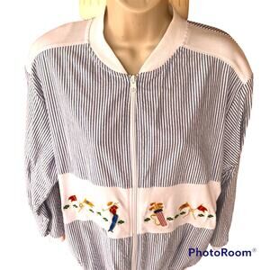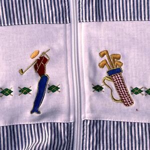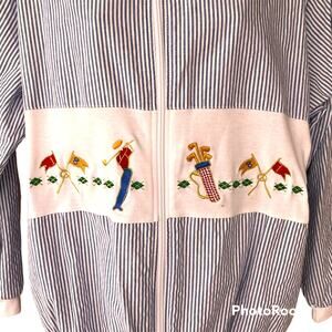 Retro style lightweight zip front windbreaker jacket by Adolfo Sport. Chambray blue and white pinstripes with white collar, cuffs, hem and shoulders. White block across middle with decorative golf and argyle embroidery. 2 hidden slash hand pockets. Super cute and unique! One of 2 shoulder pads missing and very small, pin-sized small stain on front left near shoulder (pic). Good, vintage condition. Women's size medium.