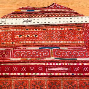 This is an absolutely gorgeous, vintage/antique, hand-embroidered Hmong coat. It is unisex, but fits as a women's L or XL or a mens M to L. It is oversized, lined, warm, and does not have buttons. The coat is in excellent shape considering its age, structurally strong and wearable. 2 hand pockets on the sides.