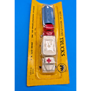 Vintage Metal Miniature Trucks by Barclay from Union City N.J, , No. 341 in the 29 cent series. Great die cast toy vehicles for your collection. Package includes a set of 2 trucks, an Ambulance and a tanker truck. Barclay brand toy vehicles are great collectible toy, with attention to detail. These are new in the unopened package, but there is some wear to package.