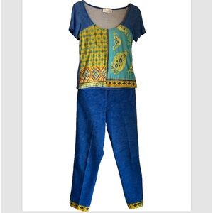 Top (Size Small): Soft stretch knit (94% Rayon, 6% Spandex) with a vibrant patchwork print in blue, yellow, and teal. Scoop neck, short sleeves, easy flattering fit.