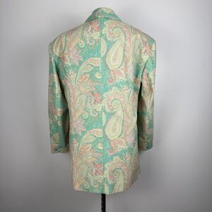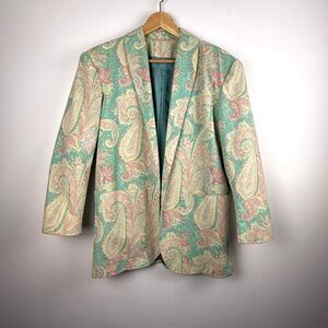 Bold and vibrant paisley print blazer in pastel tones of mint green, coral, and soft yellow. Features a structured silhouette with padded shoulders, single-breasted front, and an oversized fit. Made from a thick, textured jacquard-style fabric with full lining. Great statement piece for eclectic, retro, or artsy wardrobes. Unisex and versatile — perfect for layering, festival looks, or streetwear styling.