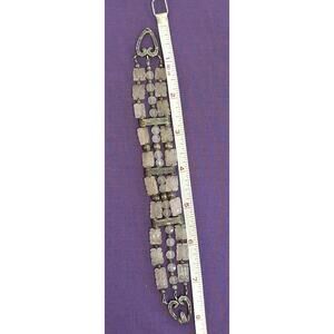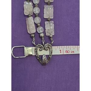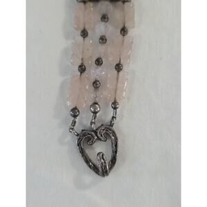 This is a rare vintage bracelet made of sterling silver with carved rose quartz layered beads. The bracelet has a beautiful textured heart shaped hook closure and is 8 inches in length when laid out. It will fit about like a 7.5. The main stone color is light pink and the metal purity is marked as 925. The silver all tested positive for sterling, and I will leave the tarnished patina as is. The bracelet is pre-owned and may have minor wear but still looks to be in good wearable condition. Great vintage piece!