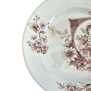 Fair vintage condition with no chips or cracks, but has discoloration this antique plate is off-white ironstone with brown transfer ware print of flowers and a patch with an illustration of a young dreamy girl holding a rake. See photos of discoloration.