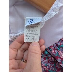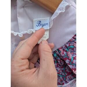 Rare Vintage Bryan Lavender Bergundy Lace Ruffle Floral Dress Toddler 3t Cottage. Dress is in very good condition. The bow was not originally part of the dress. It was added with a safety pin but appears like it was meant to be there. There is on tiny pink mark on the white lace of one sleeve. See up close photo.