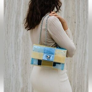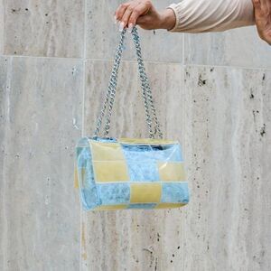 This beautiful rare vintage shoulder bag from Chanel is a great everyday accessory to your Summer wardrobe. Crafted using beige & blue PVC plastic, it features patchwork pattern all over, a transparent design, turn-lock closure, chain straps, and a spacious inside. Perfect for every occasion!