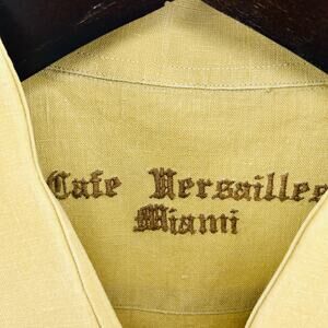 Excellent vintage condition, with the exception of 2 missing buttons, one on each side of back vent. Rare collectible guayabera with Café Versailles Miami embroidery, four front pockets, pintuck pleats, and button details. Linen or linen blend.
