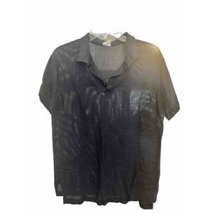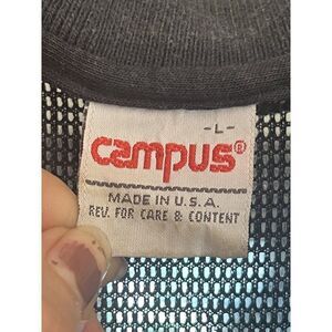 This rare vintage Campus men's polo shirt in navy blue is a must-have for any preppy California vibe lover. The shirt features a mesh knit design and short sleeves, making it perfect for the beach or any casual outing. The shirt is a size L and fits regular, with a brand tag that adds to its authenticity.