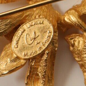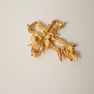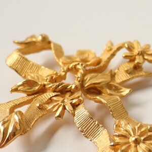 Crosses are a signature of venerable designer Christian Lacroix and none of them are more beautiful or versatile than this gold-plated design that's in excellent condition. The feminine design features a heart at its center along with ribbon and floral flourishes.