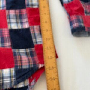 Long-sleeved, button-front, shirttail hemmed women's blouse fashioned from authentic patchwork squares in navy blue, red, and various coordinating plaids with accent colors of white and gold. Expertly tailored with a placket, collar and cuff lining of light chambray blue! Extra buttons still attached. The size label is missing but I would estimate it as a Large. The measurements taken flat are: Bust at Armpits 22", Sleeve Length from Armpit 17", Length from Armpit to Side Hem 12", Length from Shoulder to Middle of Back Shirttail Hem 28". In excellent preowned, vintage condition!
