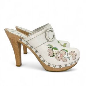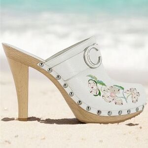 These stylish and sophisticated clogs are a must have from the iconic Christian Dior by John Galliano. Crafted from white leather with embroidered floral print on the front, they feature round toes, the brand's CD on the uppers, leather insoles and soles, and wooden stiletto heels. Grab these perfect Summer shoes now!