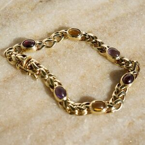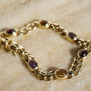 Incredibly well built solid 14k Yellow Gold bracelet with a push lock. It features a unique fancy braided link pattern with colored gemstones in between. Similar to the iconic Bvlgari designs from the 80's which sell for $30-40k. In stock and ready to wear