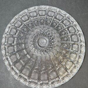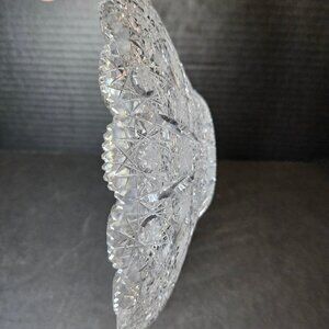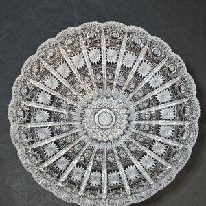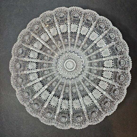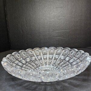 Simply stunning! Words and pictures don't do this gorgeous glass crystal bowl justice. There are so many hand cuts on this piece, and the name Queen Lace is so appropriate because it looks very lacy. This round, shallow bowl is European Czech Republic, Bohemian Finest 24% lead hand cut crystal. Handcunt 24% lead crystal. Blown glass handcrafted. Unmarked and labeled missing. Thick and heavy, Safe for daily use. Hand wash only highly recommended. Weight 2 lbs. 15 ounces minus shipping and double boxes and shipping materials. Note, we do not accept returns on vintage. Please review carefully. Measurements, 9 inches in diameter. 2.5 inches high. Excellent vintage condition. No chips or cracks. All teeth on the Sawtooth rim accounted for. Vintage Bohemian Czech. Queen lace handcut lead crystal blown glass. Bohemian leaded glass (crystal) is renowned for its exceptional clarity. Brilliant and sparkle. This is an outstanding, gorgeous vintage piece. Insurance included in the purchase of this item for full amount. We take super care in packing all fragile items and take pride in getting items to their new homes intact. Non smoking pet free home. #UB2