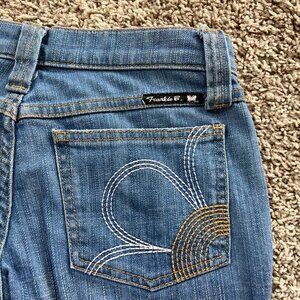 An ultra-rare pair of Frankie B jeans featuring unique sunflower-style embroidery on the back pockets. A true collector’s piece for Y2K denim lovers.