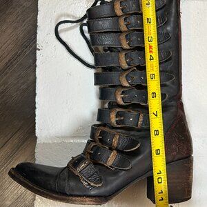These vintage Stoke boots are a unique and rare vintage treasure! Freebirds are known for quality leather, traditional craftsmanship, and durablitity; these were purchased at the flagship store in Cherry Creek. There is no exception with the Stoke, which feature purposely distressed buckles, leather laces, an interior zipper, and a small heel. These are in a fair preloved condition, have signs of wear on the bottom front, as well as several scratches, all pictured.