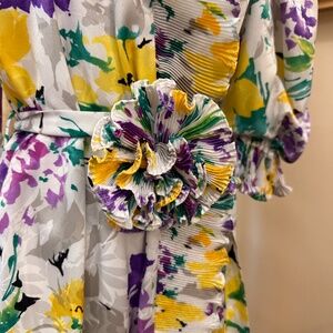 This petite Georgette Trabolsi gown features a pleated, ruffled neckline that continues all the way to the hem, and also featured on the puffed, cap sleeves. The gown is belted, and also has an inner tie to secure it's wrap styling. There is also a gorgeous pleated ruffle rose georgette at the front that really brings the fun and glamour to the piece.