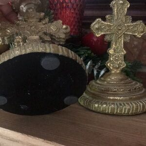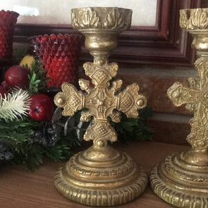 Rare Vintage Gold Cross Candle Holders Set.Very old and in excellent vintage condition for 60 years of age with normal wear.Add these Rare vintage collectible beauties to any home decor or perfect gift.Ships fast.Arrives beautifully packaged.7” tall
