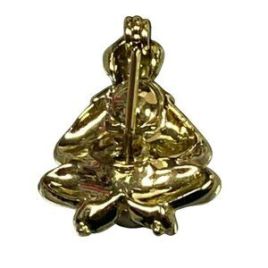 This vintage brooch portrays a genie holding a pearl resembling a crystal ball. Its intricate design and gold tone offer a touch of mystique and elegance.