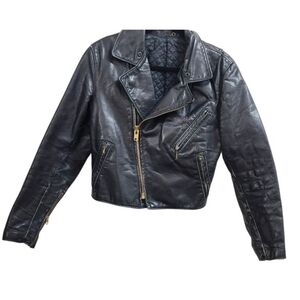 The product is a rare vintage Golden Bear black leather jacket from the 70s-80s, featuring a classic motorcycle style with a zip closure. This size M jacket is perfect for casual occasions in the winter and fall seasons, and is made with high-quality leather that requires dry cleaning for care. The jacket has a solid black color and is a timeless piece for any man's wardrobe, showcasing the brand's craftsmanship and design from the United States.