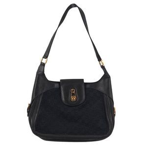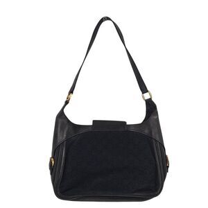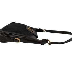 This vintage Gucci structured handbag is a classic, crafted from soft black monogram canvas with leather trim. Its timeless design features 24KT gold hardware, recently replated in 2024, adding an elegant touch. The interior is lined with tan leather in good condition, showcasing Gucci’s iconic craftsmanship. While there’s minor creasing near the strap buckles and leather has been recently conditioned, the bag remains a stunning vintage piece.