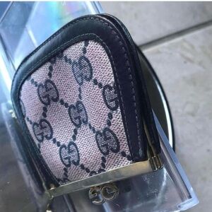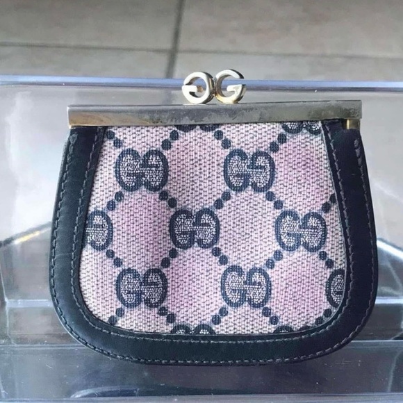 Chic Gucci coin purse with iconic gg pattern. Features pink and black design. Ideal for a touch of elegance.