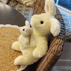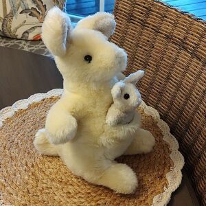 Vintage Gund Plush Kangaroo and Joey Rare Stuffed Animal from 1986. Joey is still attached to the Mom. The plush makes a noise when it's moved. Super soft and plush.