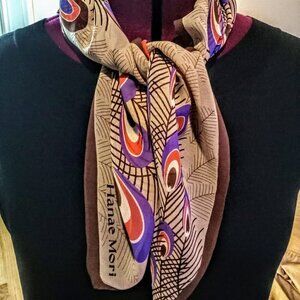 Rare vintage square pure silk scarf from Hanae Mori features a bright peacock print on a sheer brown background with hand-rolled edges.