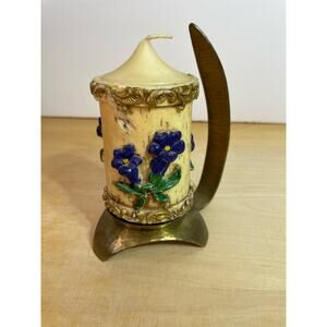 This is a really unique swiveling candleholder, beautiful hammered brass, in great condition. There are some small patina spots on the brass. The candle is handpainted and there are a few melted areas.