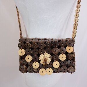 A charming bag crafted from coconut shells, featuring a floral design and zippered closure. Lightweight and eco-friendly, ideal for casual outings.